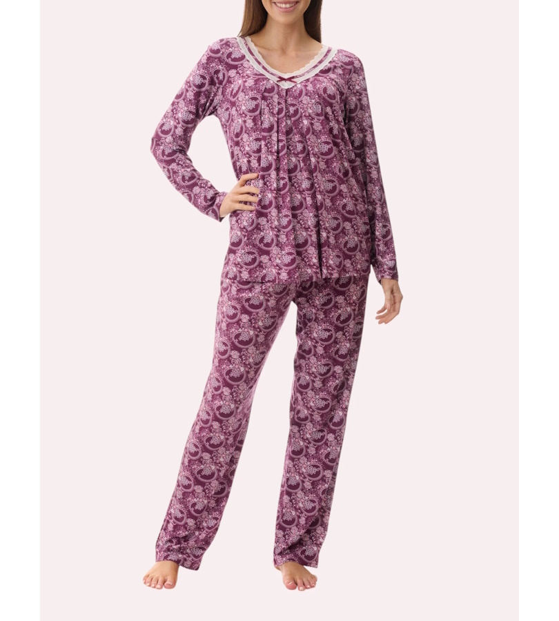 Long Pyjama with long sleeves in the gorgeous deep plum "Chloe" print. The v-neckline features a white lace trim with self flat binding and pleats at the centre front. A sweet pink satin bow adorns the front neckline. MODAL knit is beautifully soft and comfortable.