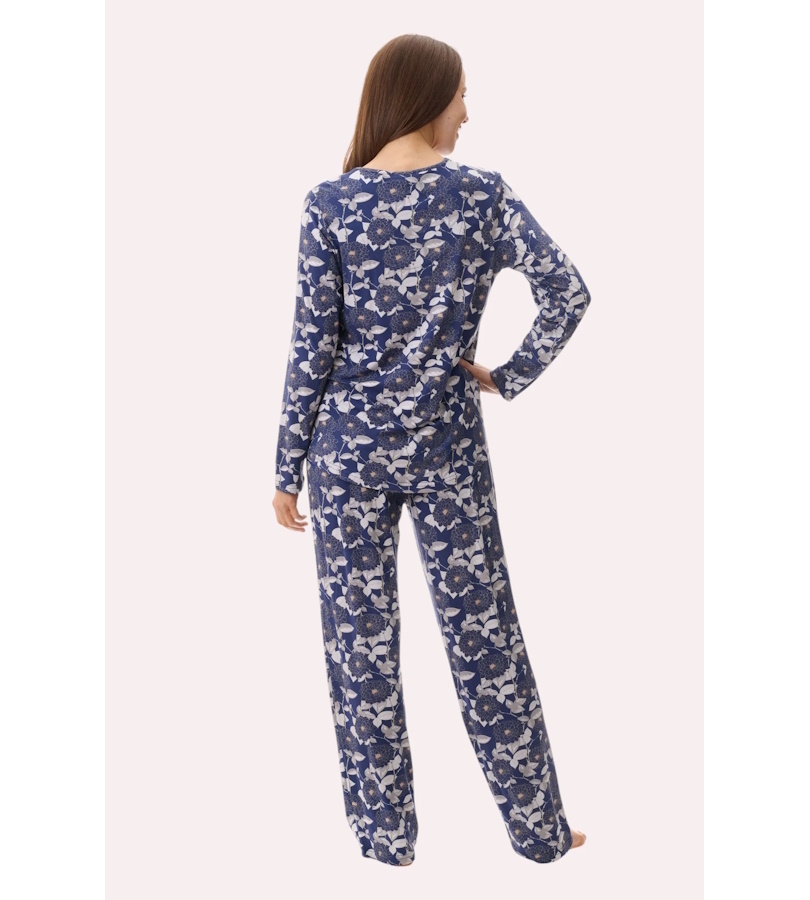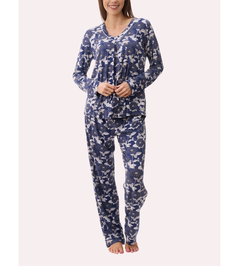 Long pyjama with long sleeves in the striking navy based print "Coco". V neck band on the top with narrow lace trim, an inverted pleat at centre front. The long pants have a comfortable elastic waist with a drawstring. Our slinky knit is beautifully soft and comfortable to wear.
