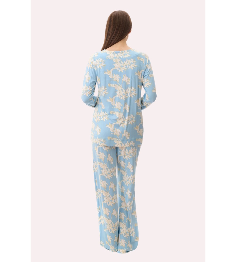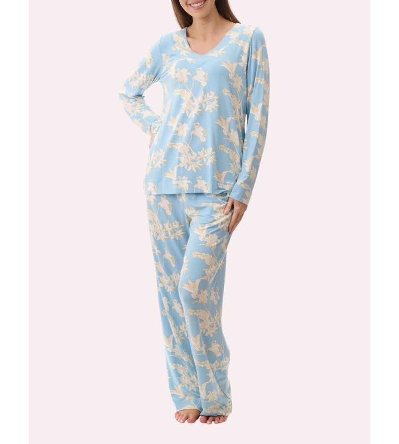 Long length pyjama in the eye catching "Gia" turquoise print. V-neck top with exposed cover stitch detail and long sleeves. Long loose leg pant for comfort with side pockets, elastic waist and drawstring. MODAL knit is beautifully soft and comfortable.