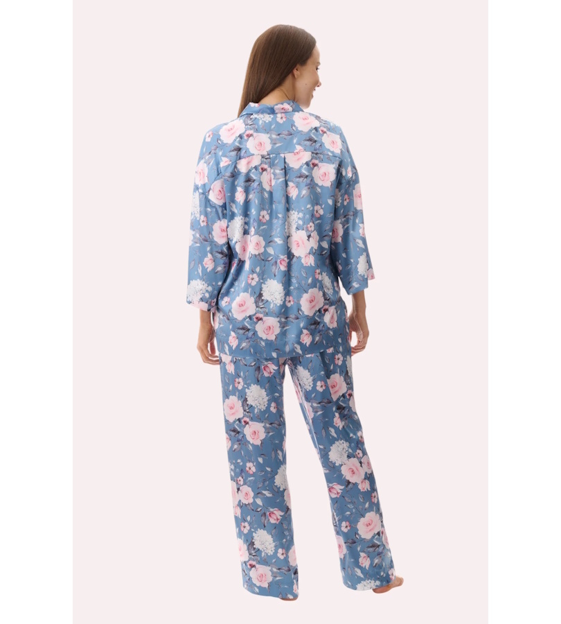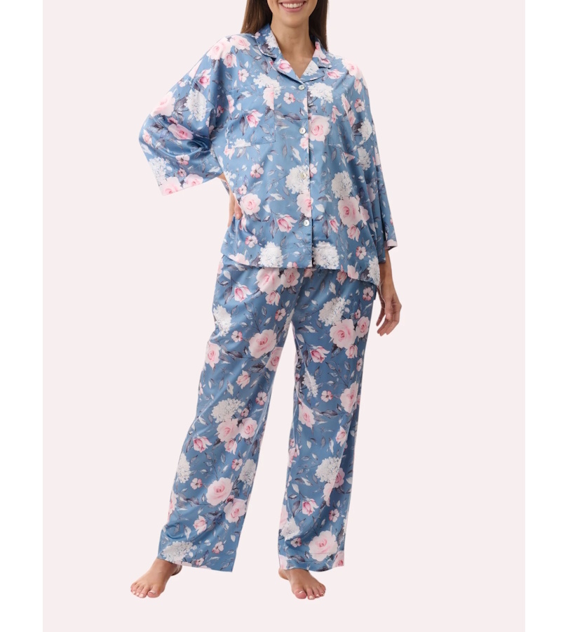 Pyjama with ankle length pant and 7/8th sleeve length top in the dreamy "Jaclyn" floral print on stretch satin. Full button opening, collar and chest pockets. Relaxed fit with back slightly longer than the front with side splits and back yoke with tuck. Pants have a comfortable elastic waist with a drawstring.