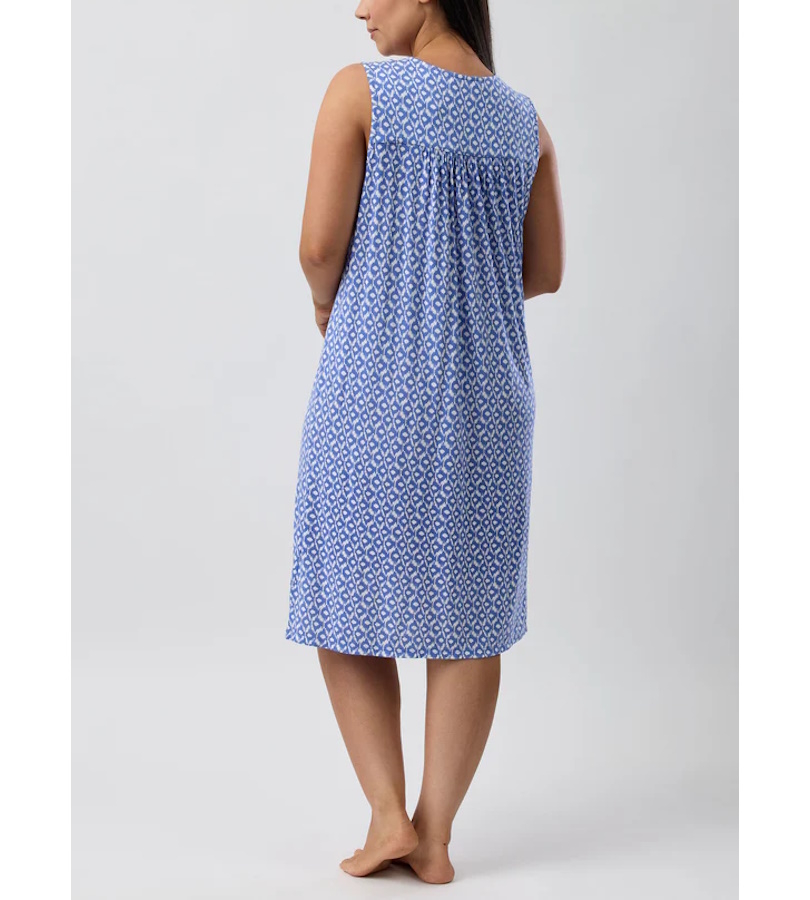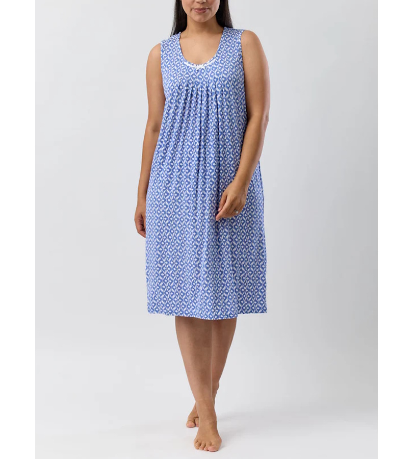 The Aztec Sleeveless Nightie combines sophisticated style with luxurious comfort. Crafted from silky soft viscose jersey, this sleeveless nightie showcases an elegant Aztec print enhanced by delicate grosgrain ribbon trim and subtle pleating. Its lightweight fabric and refined details create a graceful silhouette perfect for serene evenings and relaxed moments.